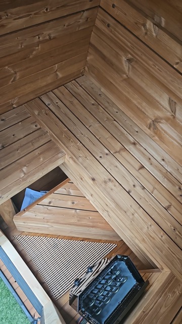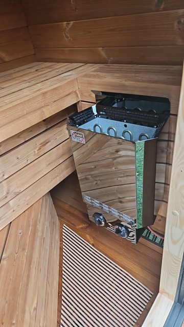 De sauna is vervaardigd uit thermowood van 40mm. De banken en rugleuningen zijn gemaakt uit aspen.
