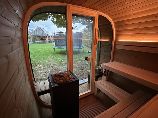 De sauna is vervaardigd uit thermowood van 40mm. De banken en rugleuningen zijn gemaakt uit aspen.
