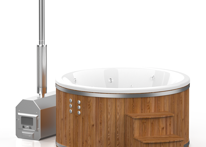 Deze hottub komt met een externe houtkachel. Op die manier heb je een ruimere hottub en is de kachel mogelijk los te koppelen en te verplaatsen of zelfs vervangen.